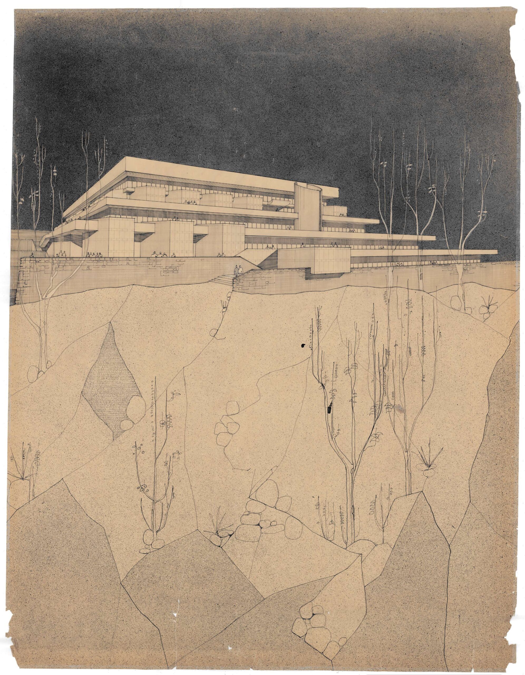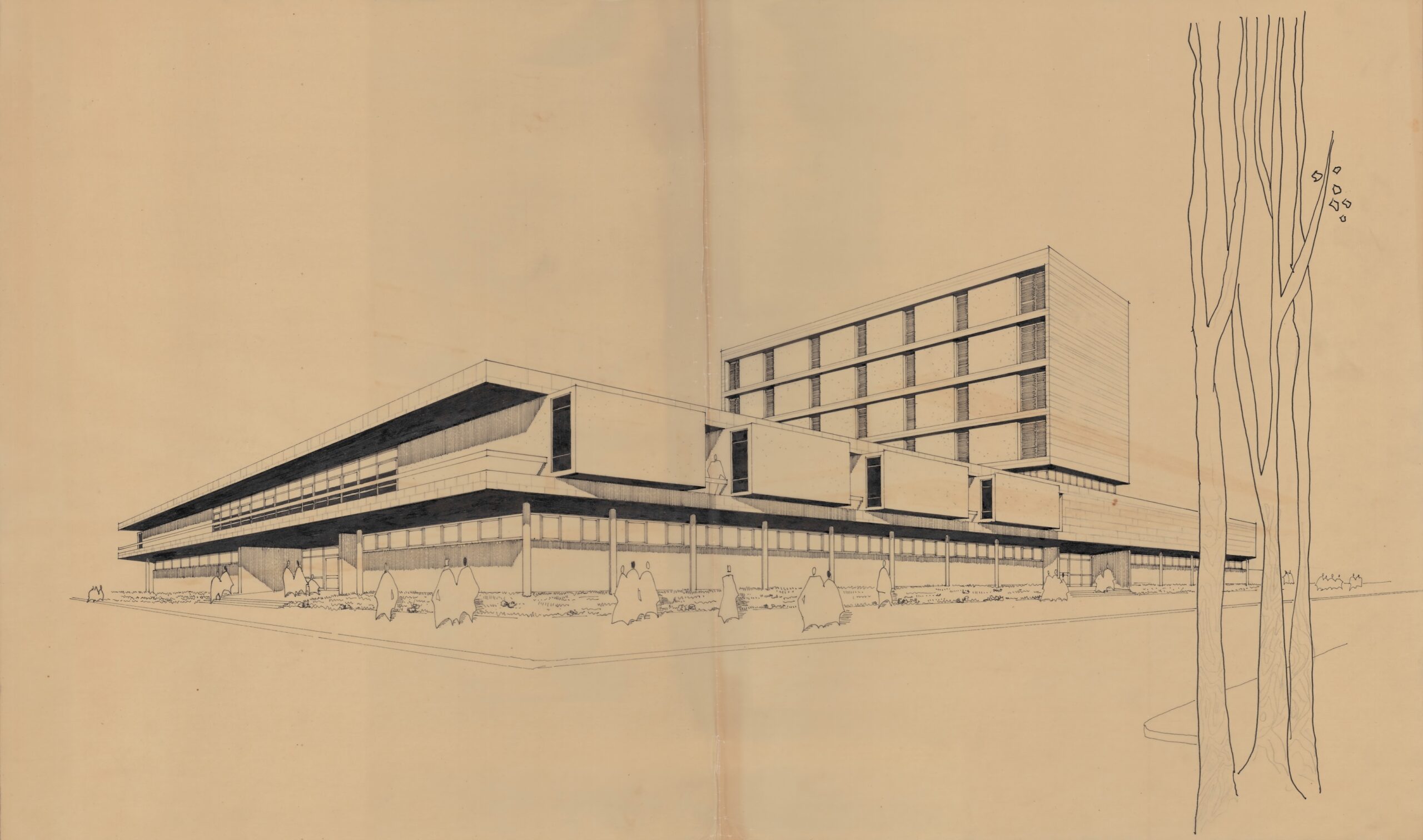 ב־1967, זמן קצר לאחר חזרתה של האוניברסיטה העברית לקמפוס הר הצופים, הופקדו האדריכלים רם כרמי, דוד רזניק, שמואל שקד וחיים קצף על התכנון הכולל של הקמפוס. הבניינים שתכננו יצרו רצף אדריכלי מִִבנני, המשמש חומה מגוננת על המבנים הפנימיים במתחם הקמפוס.