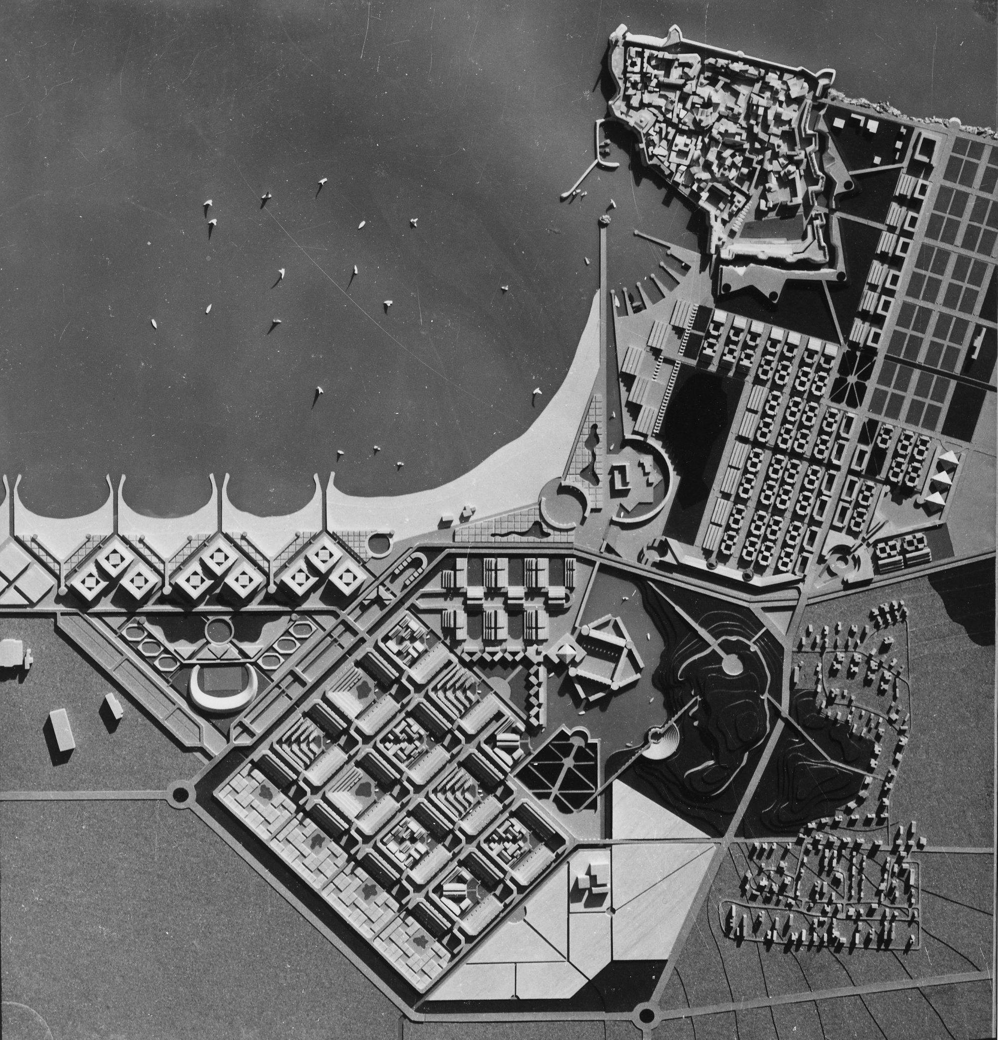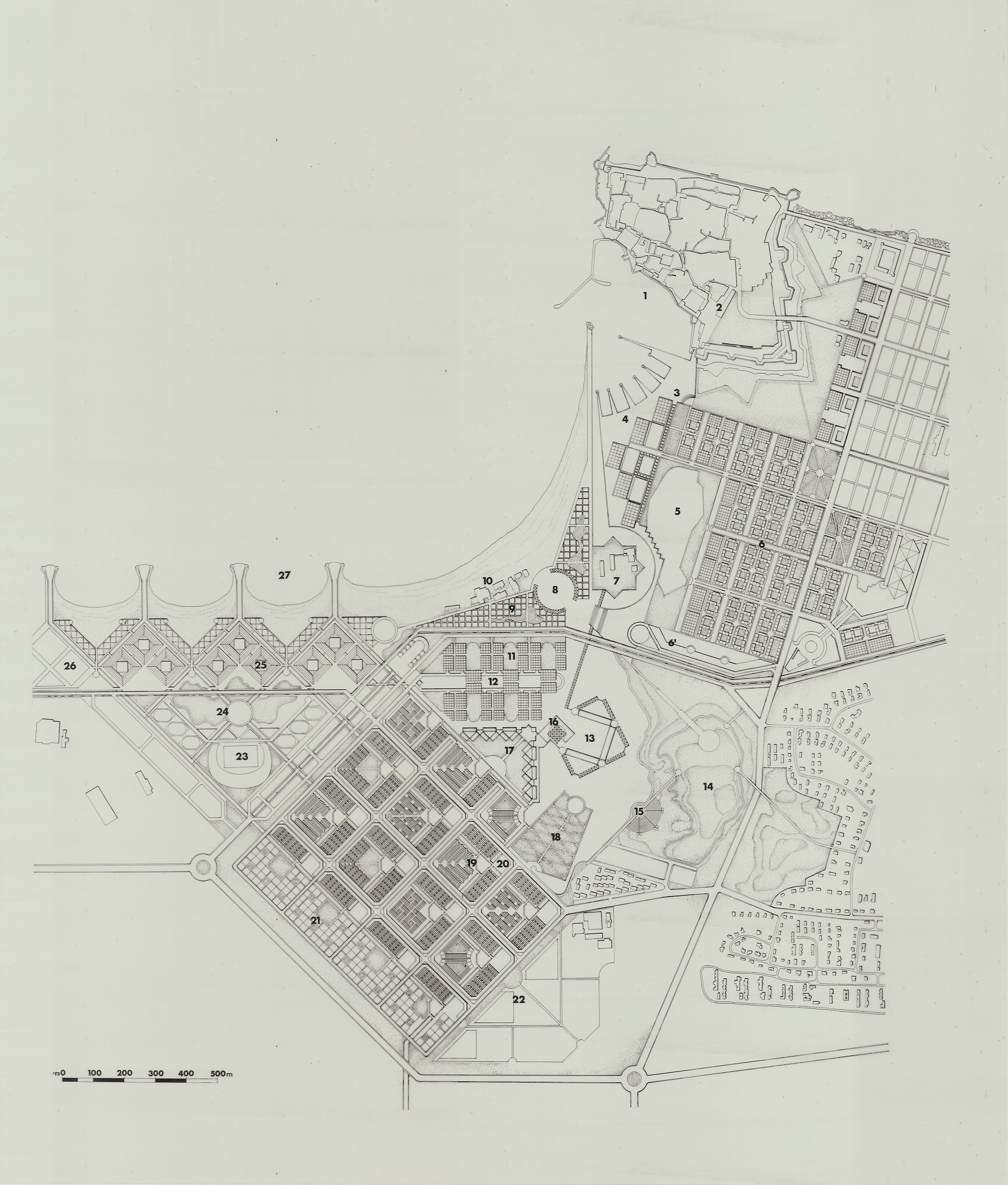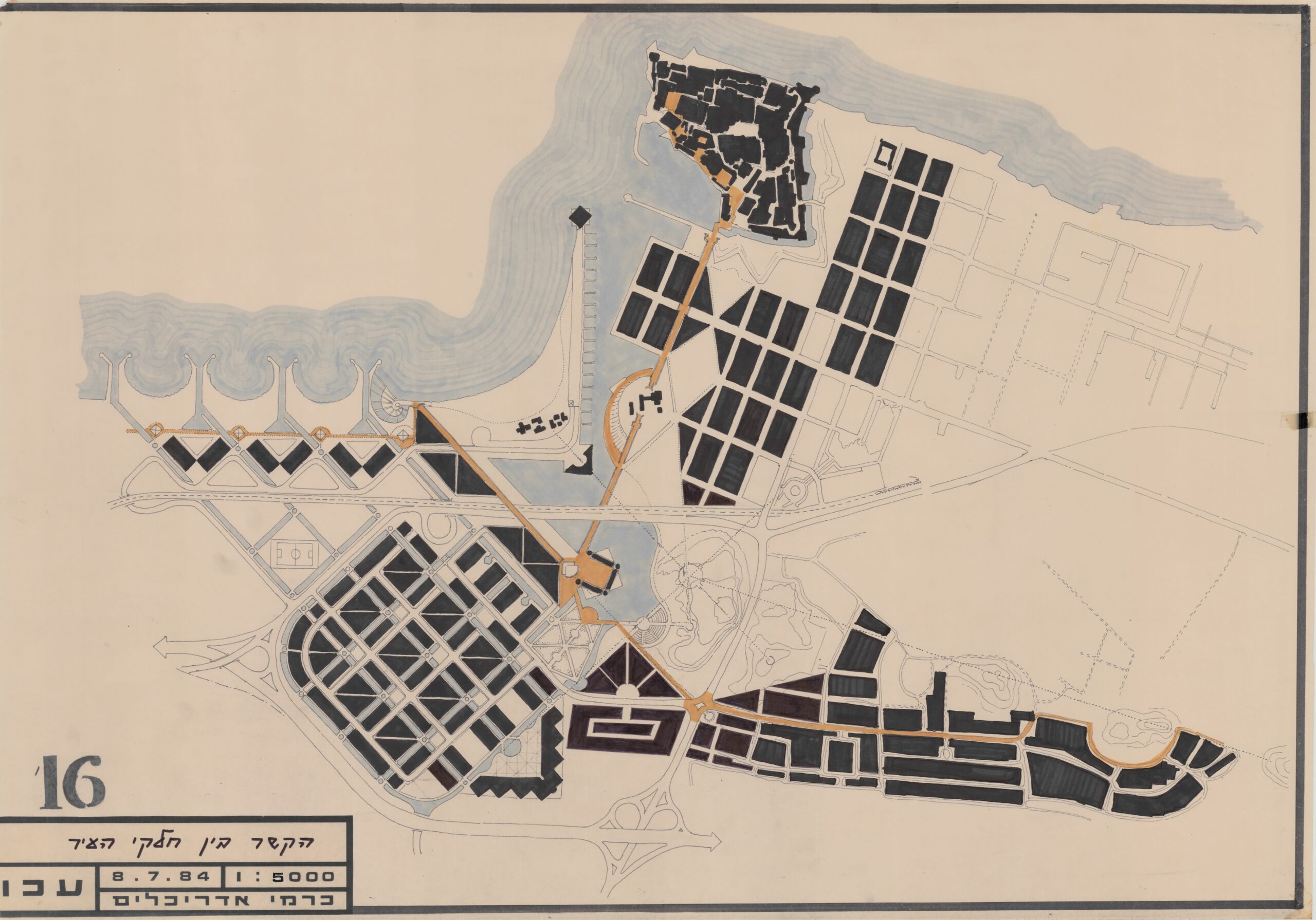את האיחוד בין חלקי העיר ביקש כרמי לממש באמצעות פרויקט פיתוח שאפתני, שיחבר את הדרום המוזנח של עכו – אזור נרחב הכולל את העיר העתיקה, גבעת נפוליאון, נחל נעמן וחוף אלמוג – למרקמים העירוניים המודרניים יותר בצפון העיר. בתוכניתו היטה כרמי את הערוץ של נחל נעמן אל גבעת נפוליאון והציע שכונת מגורים חדשה בדרום העיר, הערוכה בגריד אורתוגונלי בדומה לזה של העיר המנדטורית. בתכנון השכונה שולבו תעלות מים שנמשכו מן הים, והיא חוברה לשכונה המנדטורית והישראלית הקיימת, במערכת צירים שהובילו אל גבעת נפוליאון ולאורכם שובצו פונקציות ציבוריות. חזונו האורבני של כרמי לא הגיע לכלל מימוש.