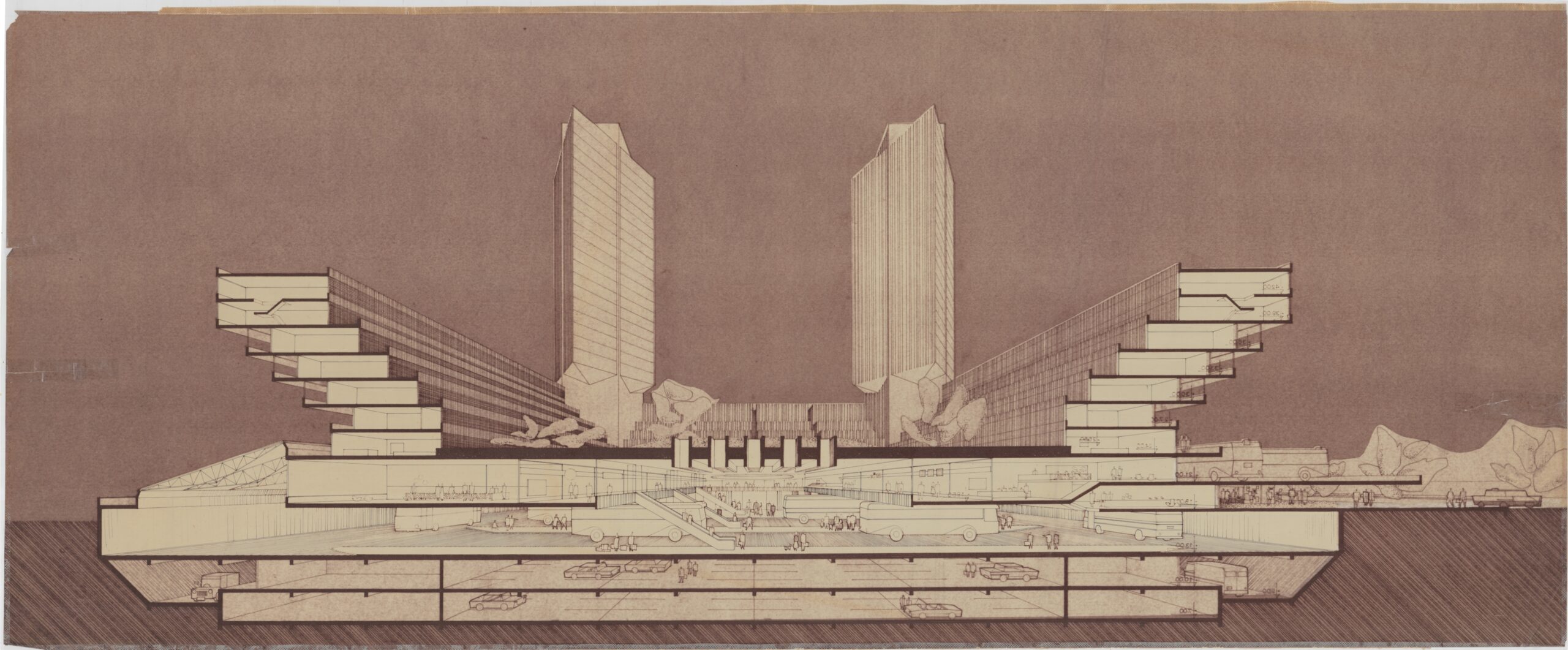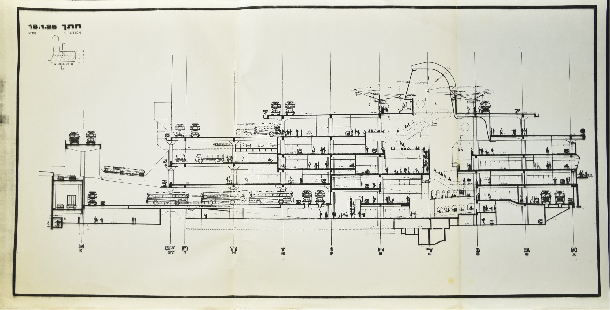 פילץ, שעבד עם רם כרמי בפרויקטים אדריכליים קודמים, פנה אליו כדי שיציע תכנון חלופי לתחנה. בשנים 1965–1976 הגיש כרמי חמש חלופות לתכנון התחנה בשטח כולל של כ־180 אלף מ״ר, ודימה את הפרויקט ל״עיר שלמה״ עם רחובות וכיכרות תחת קורת גג אחת. מבחינה טיפולוגית שינה כרמי את התפיסה הבניינית המקובלת בתחנות אוטובוסים בסדר גודל כזה. את המוקדים המרכזיים של התחנה הוא מיקם בשתי הקומות התחתונות (לחברת אגד) ובשתי הקומות העליונות (לחברת דן), ובשלוש הקומות שביניהן מיקם את פונקציות המסחר. הרעיון היה שהנוסעים ינועו בין המוקדים הללו תוך מעבר דרך אזורי המסחר. כתוצאה מכך, האוטובוסים לא יתנקזו אל קומות הרחוב אלא יטפסו בגשרים על מעטפת הבניין, בדרכם אל הקומות העליונות.